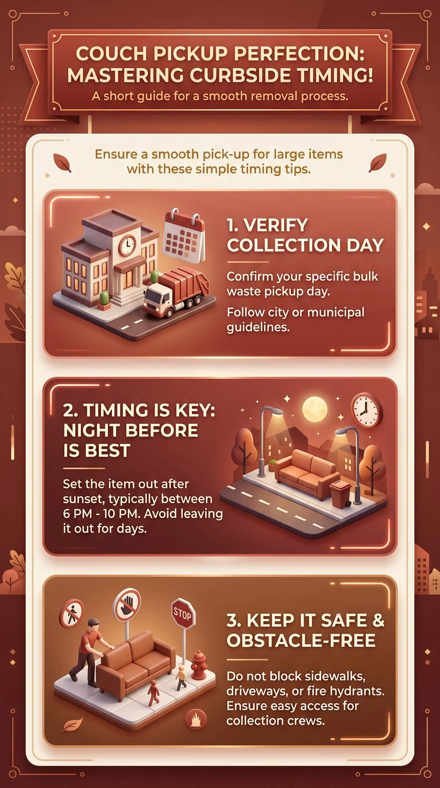 • Curbside rules vary city by city. Programs split into three models: scheduled bulk pickup, advance scheduling required, and curbside furniture not allowed at all. Always verify before placing items out.