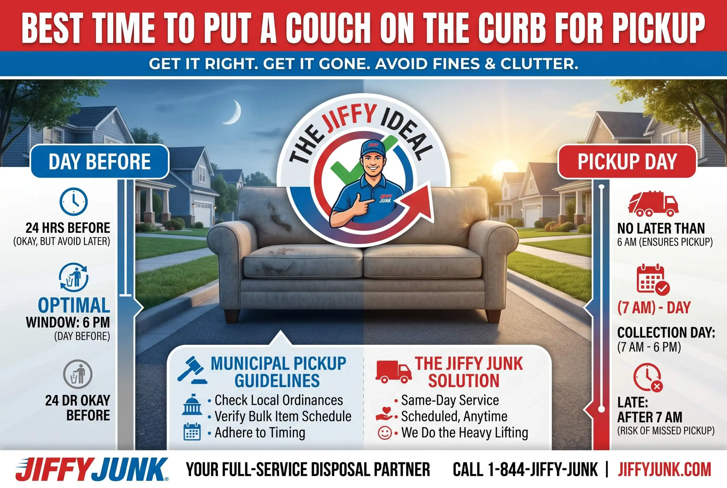 The standard window across most U.S. cities is 12 to 24 hours before pickup. Late afternoon or evening on the day before is the sweet spot. Earlier than that and you're inviting trouble: weather damage, HOA letters, neighbor complaints, citations. Later than that and the truck may already have come and gone.