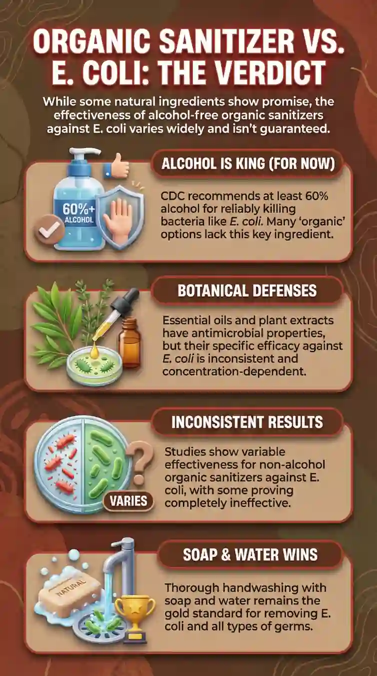 The short answer: Alcohol concentration determines E. coli kill rates—not whether ingredients are organic or conventional. The botanical oils, aloe, and plant extracts in organic formulas condition skin but don't contribute to bacterial elimination.