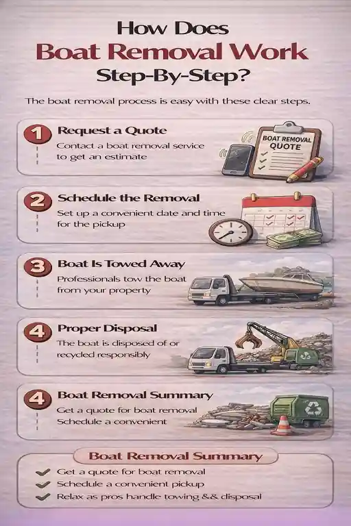 Once removed, the boat is recycled, salvaged, or disposed of responsibly according to regulations. The site is cleared of debris, similar to a garage cleanout, leaving the area clean and compliant.