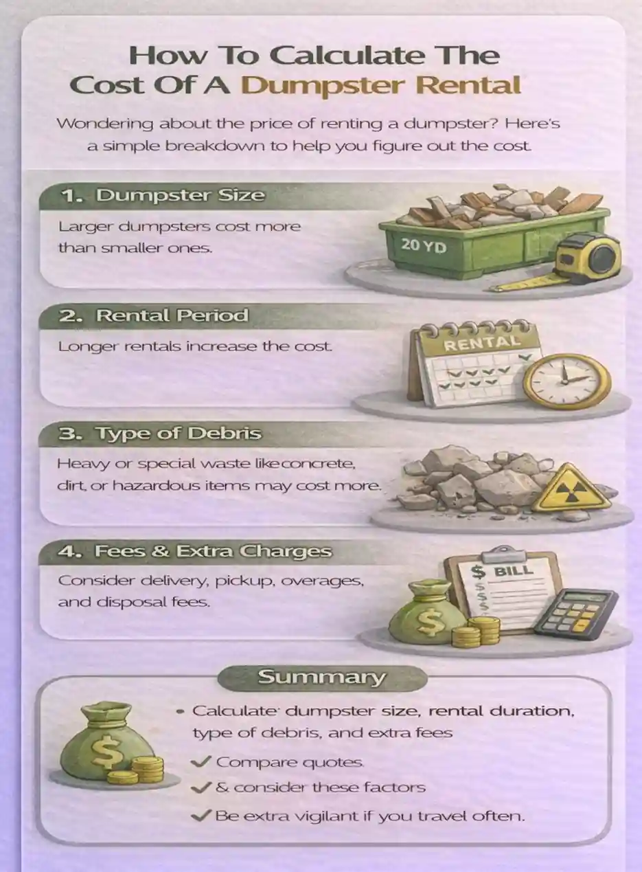 Dumpster rental costs are calculated using a pricing formula, not a single fixed rate. While most companies advertise a base price, the final cost depends on several variables that determine how much hauling, disposal, and time are involved. Understanding these factors allows you to estimate your total cost before booking and avoid unexpected charges.