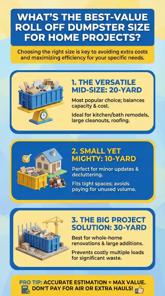 Best value strategy: Select the 20-yard container for projects generating 10-18 cubic yards of debris. The $50-$75 cost difference between adjacent sizes prevents the $180-$250 average cost of undersizing (overage fees, swap-outs, second rentals).